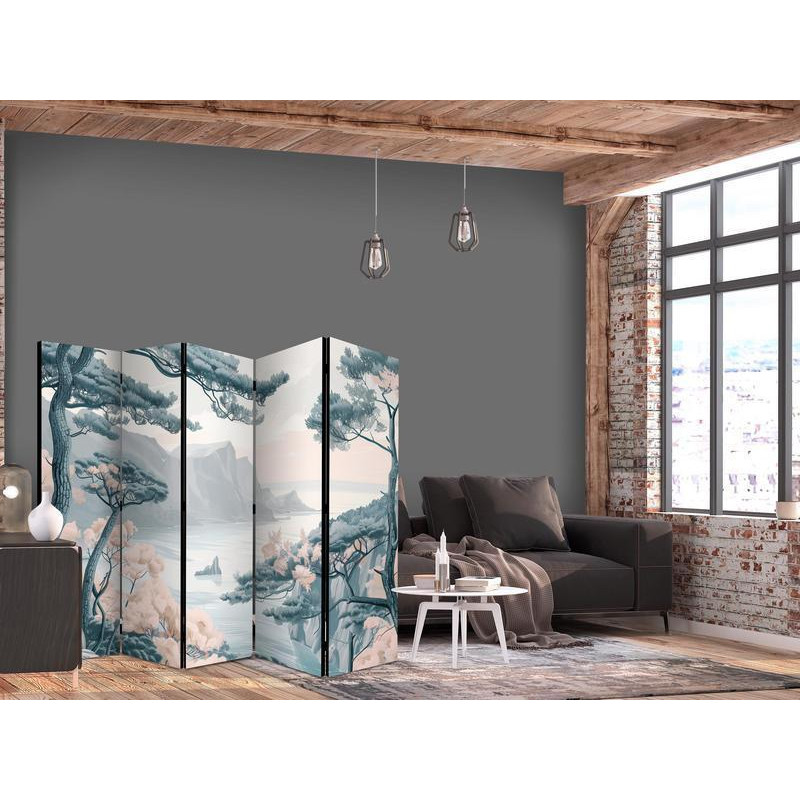 Raumteiler Paravent "Paravent - Mountainous Coast with Trees and Rocks - in Light Pastel Blues" können Sie Räume in Zonen aufteilen – das Schlafzimmer in Schlaf- und Garderobenbereiche, das Wohnzimmer in Sitz- und Essbereiche. Gestalten Sie Ihre Home-Office-Ecke und grenzen Sie den Bürobereich im Wohnzimmer mit einem stilvollen