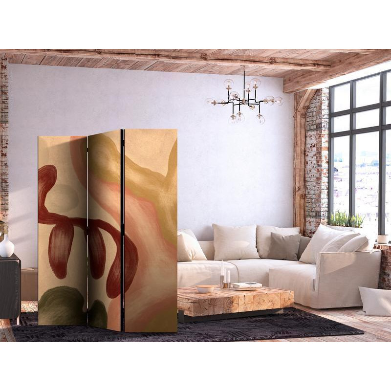 Raumteiler Paravent "Paravent - Worn Figures - Shapes in Lime Wash Technique in Warm Colors" können Sie Räume in Zonen aufteilen – das Schlafzimmer in Schlaf- und Garderobenbereiche, das Wohnzimmer in Sitz- und Essbereiche. Gestalten Sie Ihre Home-Office-Ecke und grenzen Sie den Bürobereich im Wohnzimmer mit einem stilvollen