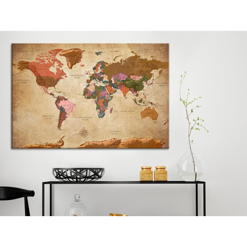 Pinnwand Bild "Korkbild - World Map: Brown Elegance" ist ein Produkt für Personen die originelle Schmuckstücke für die Wand suchen. Ökologisches Material und interessantes Muster "Korkbild - World Map: Brown Elegance" verursachen, dass die einfache Korktafel sich in ein stilvolles Accessoire verändert. Zu den Bildern auf Korken kann man Reißzwecken anheften und die besuchten Orte auf der Landkarte markieren oder Notizen anheften. Das Bild "Korkbild - World Map: Brown Elegance" auf Kork ist viel leichter als die traditionellen Wanddekorationen. Dank dem können die dekorativen Korktafeln an jedem Platz in Deiner Wohnung oder Büro gehängt werden. Die Leinwand mit dem Ausdruck wird auf die Korktafel angebracht. Dank dem, charakterisiert sich der Aufdruck mit deutlichen Farben und gibt kleinste Details wieder. Stecke die Reißzwecken oder Notizen an und kreire Dein individuelles Muster auf Deiner Wand! Die Korklandkarte ist eine exzellente Idee als Geschenk für Reiseliebhaber!