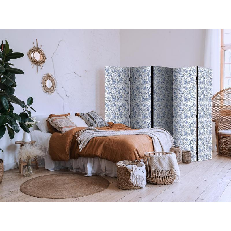 • Room Divider - Illustration in Vintage Style - Blue Flowers on a White Background