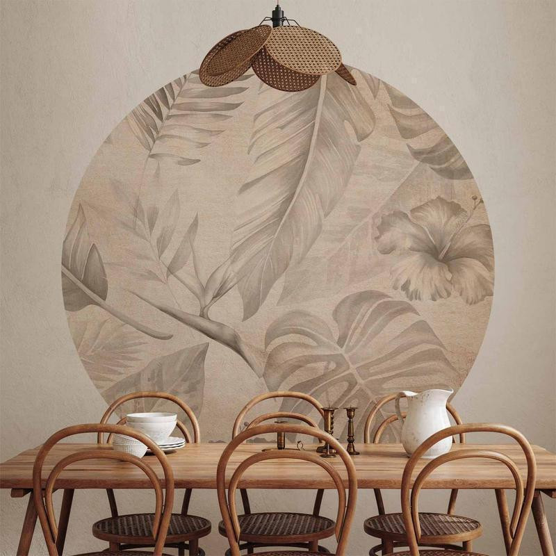 Our round wallpapers are self-adhesive, which allows you to use them as wall stickers or on any flat surface (e.g., furniture, alcoves, ceiling). Glue-free installation requires no specialist tools, and the process is quick and simple. Simply trim the wallpaper with the included knife according to the provided template. Thanks to advanced printing technology, colours remain vibrant and details sharp for many years, even in sunlit rooms. A wide range of patterns and motifs – from subtle minimalism to rich compositions – means everyone will find something to suit their taste. „Round Wall Mural - Tropics in sepia” will let you easily refresh your interior, adding freshness and a new dimension. Round wallpaper is a great alternative to traditional wallpapers, enabling continuous experimentation with your décor.