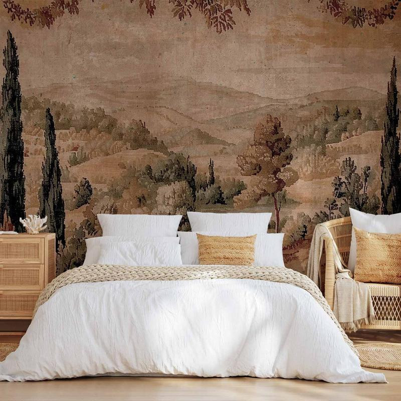 • Wall Mural - Mediterranean landscape - old tapestry with a hill and a lake