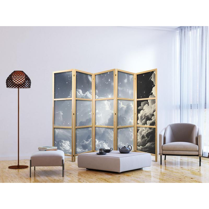 paravent intérieur japonais "Paravent japonais - Astral Calm: Stars Scattered Over Delicate Clouds" disponible dans l'offre : peut se composer de trois ou de cinq parties. Le
