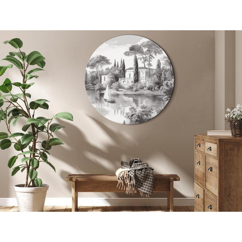 Tableau rond - Black and white vintage landscape with a pond