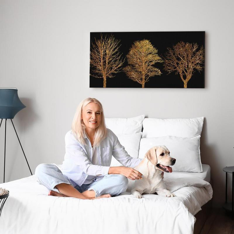 Les tableaux disponibles dans notre offre sont créés à l’aide de l'impression numérique sur toile de la plus haute qualité pour embellir votre intérieur. L’impression numérique sur toile sous la forme d’un tableau unit la tradition de la peinture sur toile avec la technologie moderne. Un effet final de ce mariage est le tableau moderne "Tableau - Golden Forest (1 Part) Wide" qui peut s’accorder parfaitement avec le style de votre pièce. Les tableaux complètent la décoration de chaque intérieur et lui donnent du caractère. La décoration murale sous la forme des tableaux constitue la dernière touche dans la décoration d’intérieur. Les tableaux déco complètent la décoration de chaque espace et la rendent plus accueillante. Souvent, ils constituent une touche personnelle dans l’intérieur, en reflétant la personnalité et le goût des habitants. Les tableaux déco que nous vous proposons dans notre offre sont des impressions numériques de la plus haute qualité réalisées sur toile. Cette technique de réalisation permet d’obtenir une image possédant une richesse de détails dont les couleurs sont vives et très fraîches. Un tableau moderne s’accorde parfaitement à des intérieurs aménagés dans le style moderne, mais aussi dans le style minimaliste et dans le style zen.