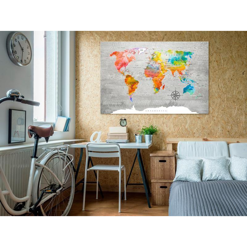 De afbeelding op kurk "Afbeelding op kurk - Multicolored Travels" is een product voor diegenen die op zoek zijn naar een originele muurversiering. Het ecologische materiaal en het interessante "Afbeelding op kurk - Multicolored Travels" patroon zorgen ervoor dat een normaal prikbord verandert in een stijlvolle toevoeging met uitgebreide mogelijkheden. In afbeeldingen op kurk kunnen punaises worden geprikt, bezochte plekken worden gemarkeerd of notities worden vastgezet. Afbeelding op kurk "Afbeelding op kurk - Multicolored Travels" is veel lichter dan traditionele wanddecoratie. Zo kunnen prikborden worden opgehangen op iedere willekeurige plaats thuis of op kantoor. Het bedrukte doek wordt aangebracht op de kurkplaat. Zo krijgt de print duidelijke kleuren en geeft het de kleinste details weer. Prik er punaises of notities in en creëer zo je individuele ontwerp op de muur! Kurkkaarten zijn een uitstekend idee als cadeau voor reisliefhebbers!