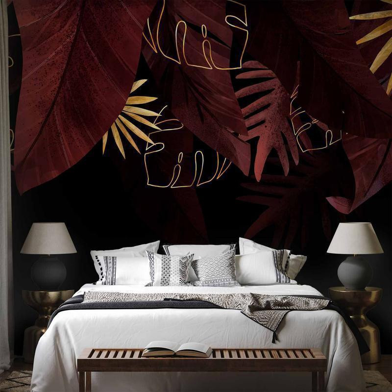 • Mural de parede - Jungle and composition - red and gold leaf motif on black background