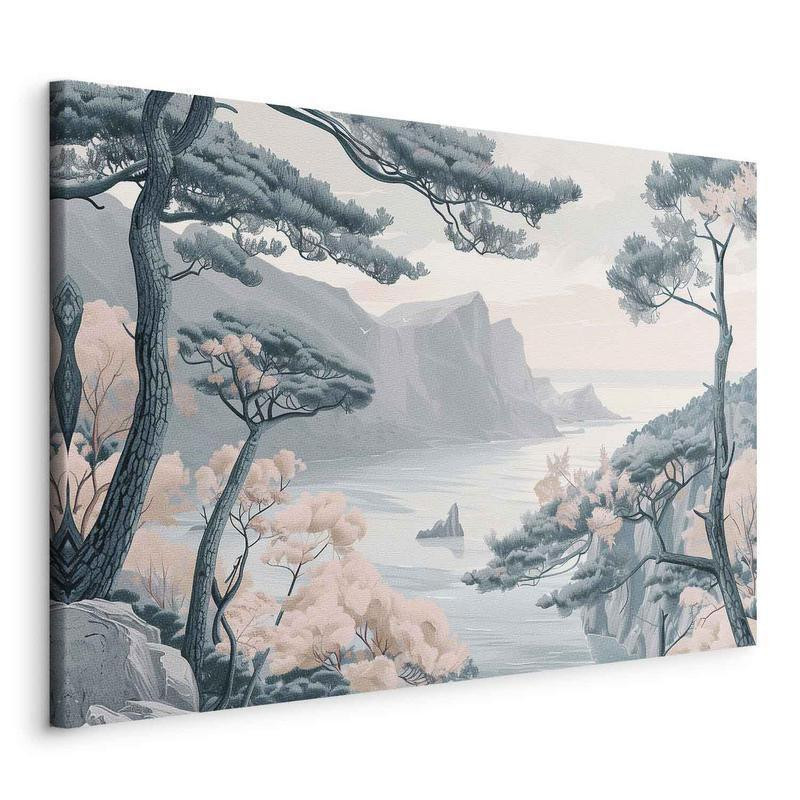 Slika - Mountainous Coast with Trees and Rocks in Light Pastel Blues